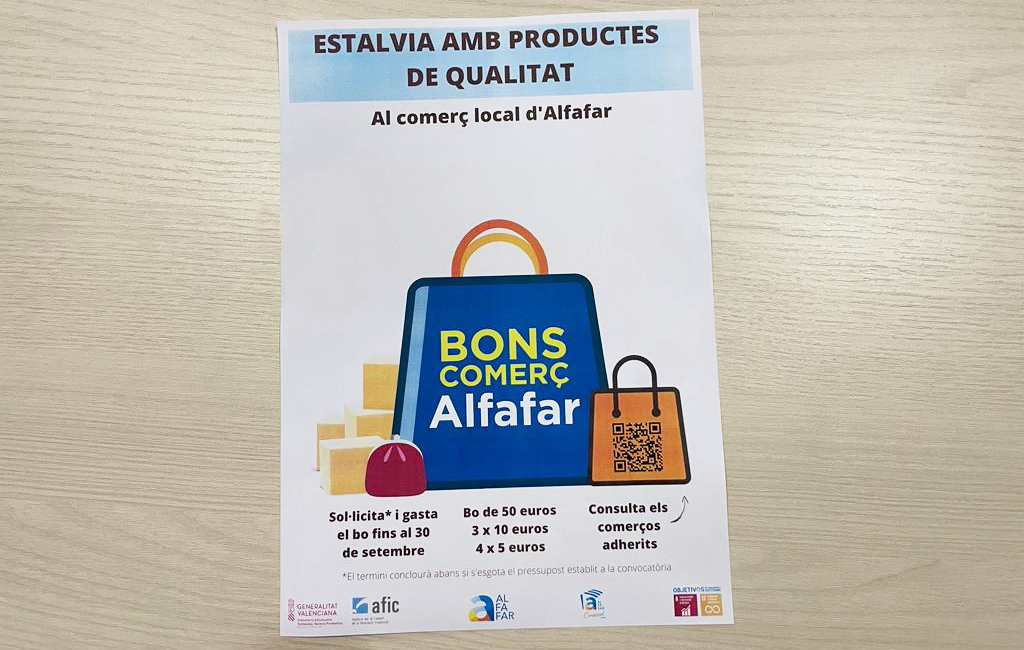 Bajo el nombre ‘Estalvia amb productes de qualitat al comerç local d’Alfafar’, los bonos tienen un valor de 50 euros, fraccionados en tres vales de 10 euros y cuatro vales de 5 euros.