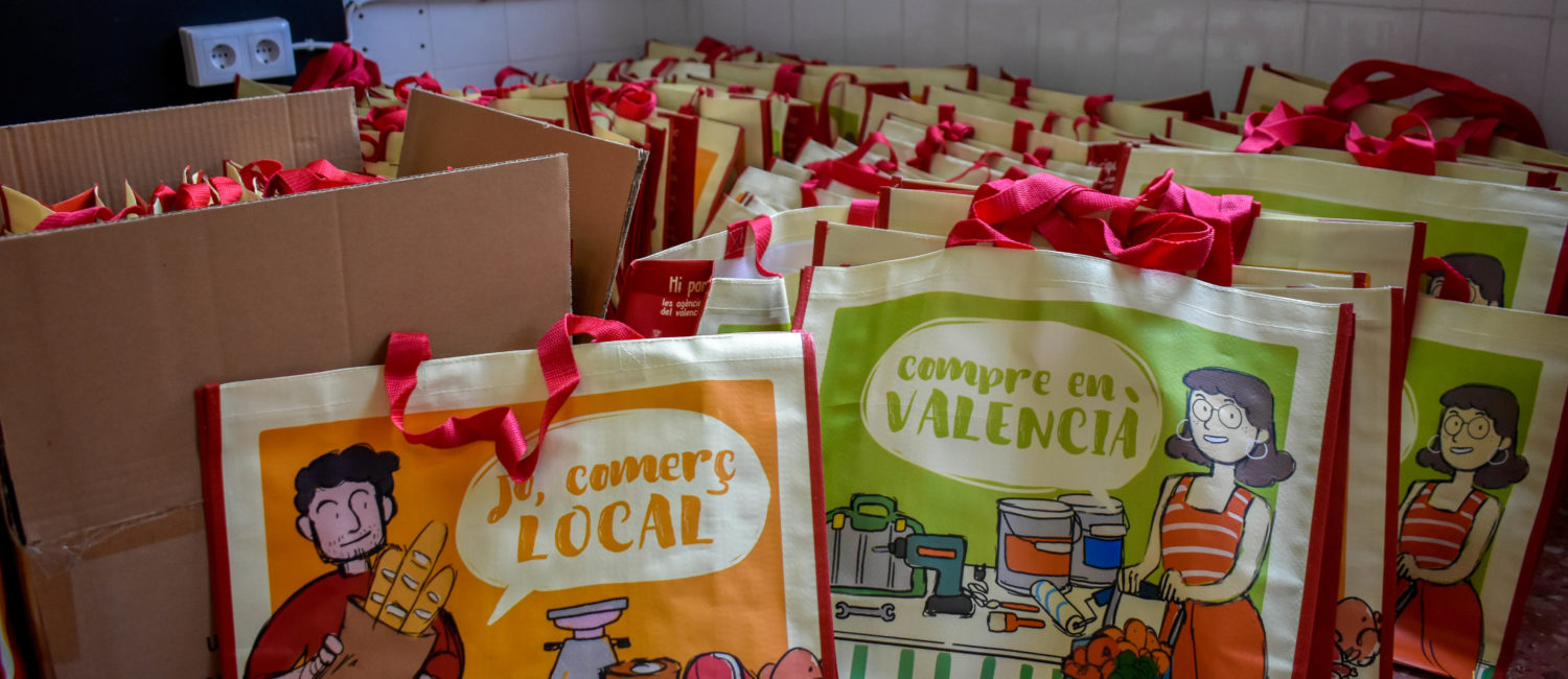 - S’han repartit una sèrie de bosses d’anar a comprar amb dos lemes: “Compre en valencià” i “Jo, comerç local”.