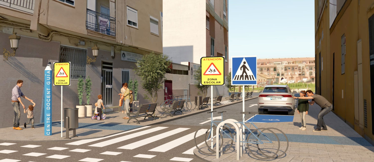 Amb la iniciativa dels Camins Escolars es prioritzaran els recorreguts transeünts, s’alentirà el trànsit confrontant i es potenciaran els espais per als vianants al voltant dels centres escolars. Així mateix, s’incrementarà el mobiliari urbà per a afavorir l’estada de la ciutadania en l’espai i s’adequarà la senyalització viària.